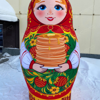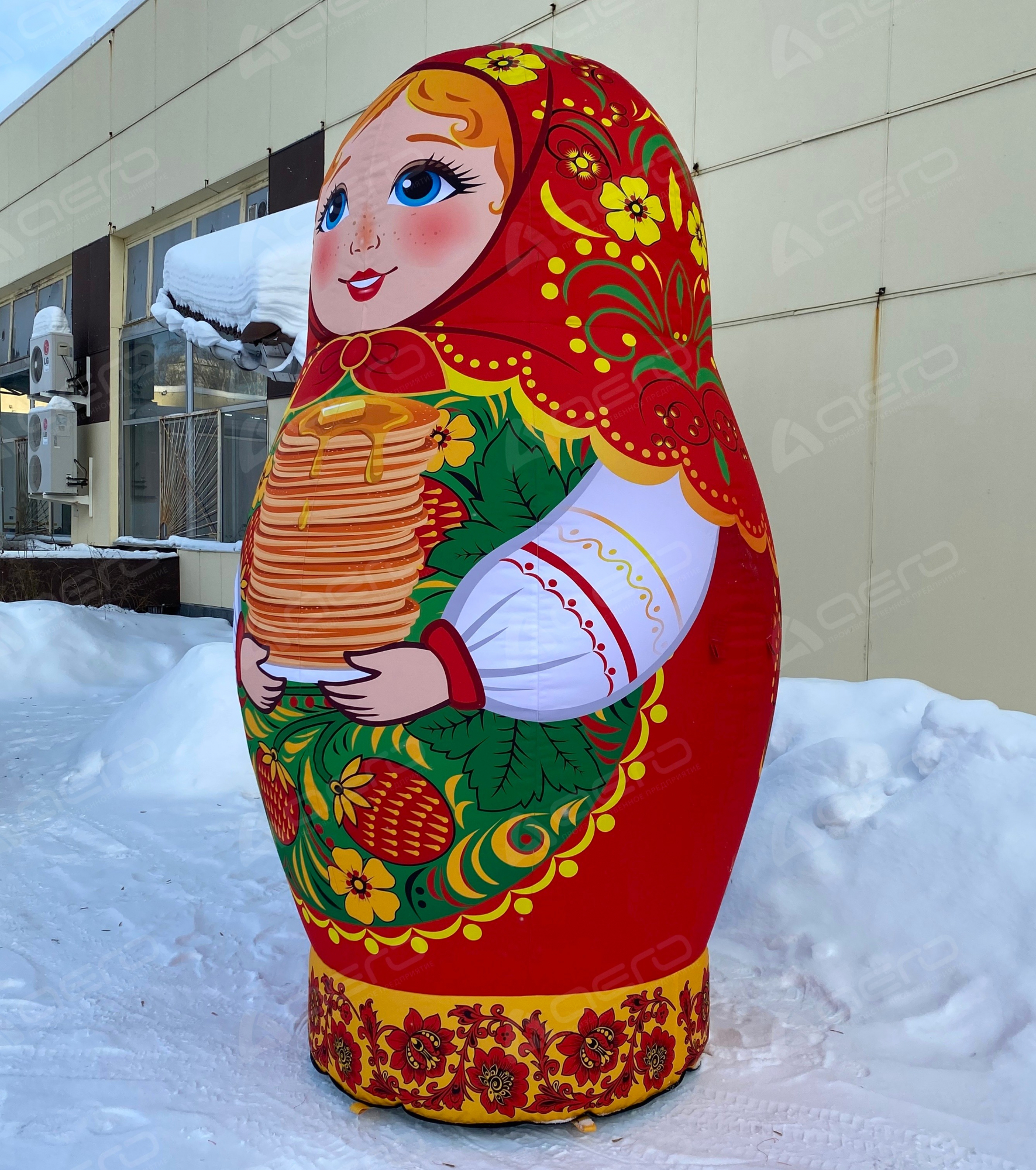 Большая надувная матрёшка держит в руках стопку золотистых блинов — главный символ Масленицы. Такой образ сразу вызывает улыбку и ощущение настоящего русского праздника с его щедростью, радостью и гостеприимством.