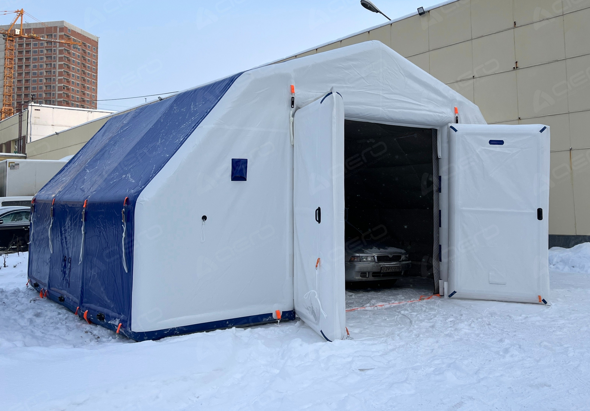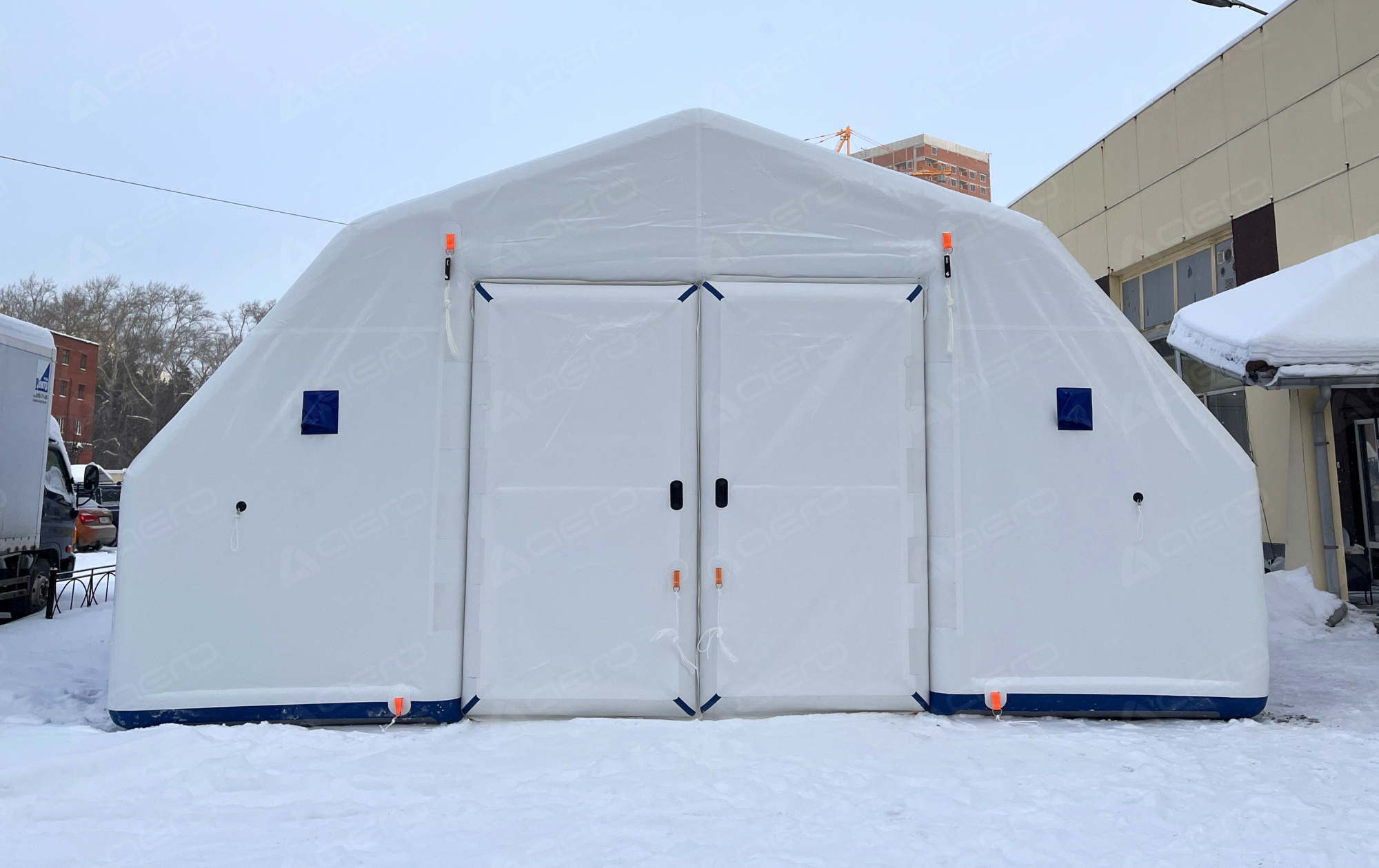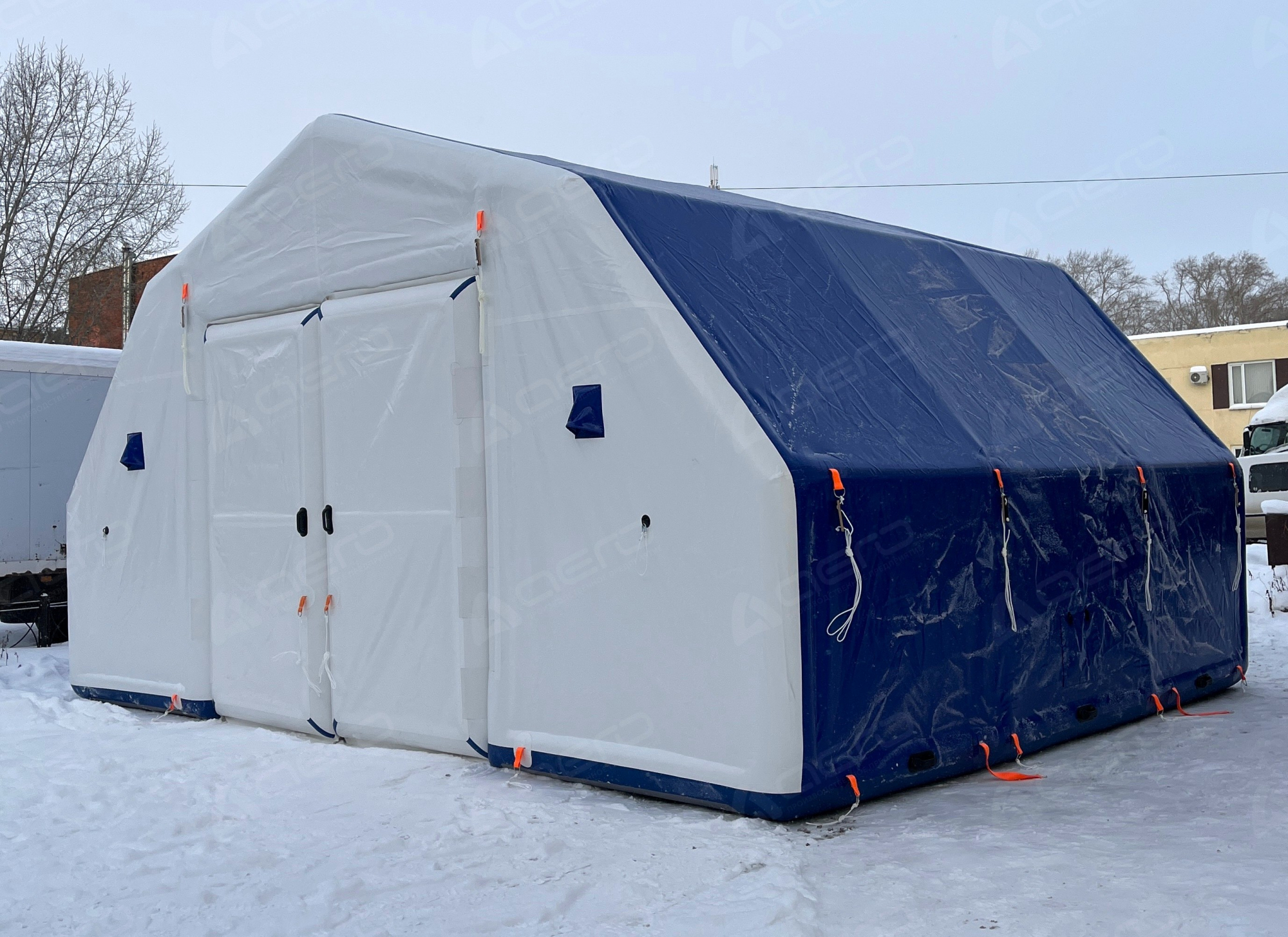Выполнен из морозостойкой водонепроницаемой ПВХ ткани 650 г/м2. Тент несъёмный. С каждой стороны имеется крепёж для растяжек к грунту для большей устойчивости на ветреной местности, а также ручки для переноса укрытия в надутом виде.