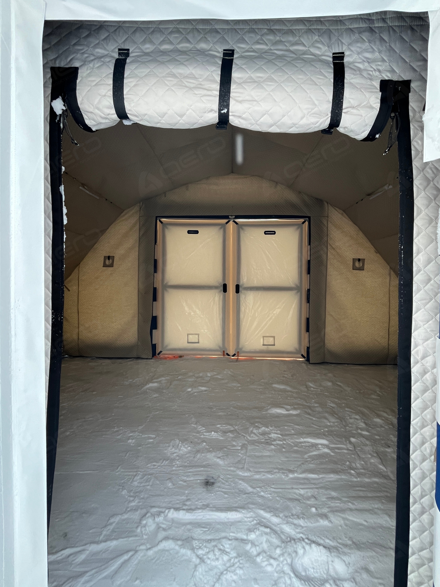 На внутреннем тенте предусмотрены крепления для кабелей электропитания в виде закрытых кабель-каналов из ткани, крепления для светодиодных светильников, а также дублирование технологических отверстий внешнего тента |