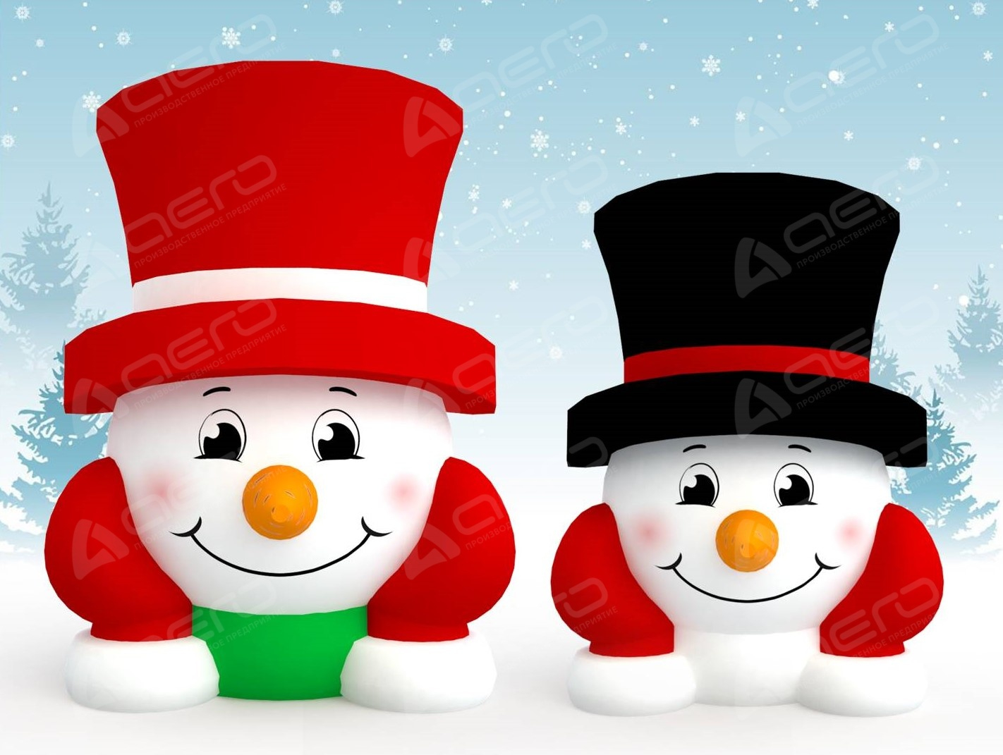 Пневмоконструкция "Снеговик в цилиндре" выполнена из заводских оттенков, но может быть выполнена с полноцветной печатью или размещением вашего логотипа на цилиндре, что сделает фигуру отличным рекламным носителем (оплачивается дополнительно).