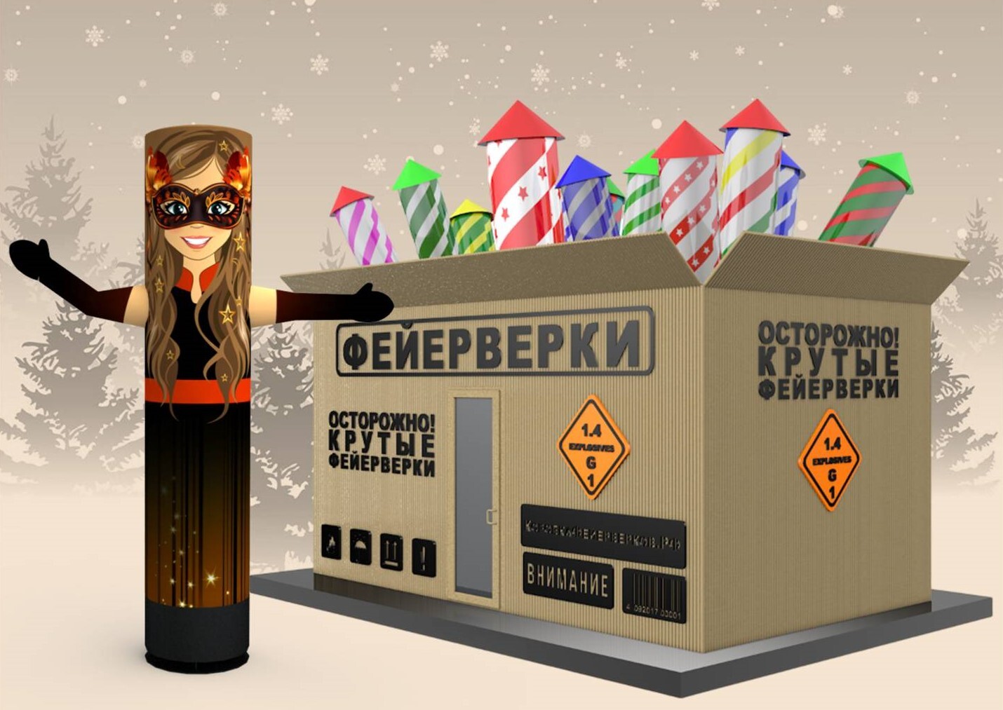 Кроме того, возможность разместить на фигуре любые надписи позволяет сделать акцент на конкретных товарах или акциях. Словами «ФЕЙЕРВЕРКИ», «ПИРОТЕХНИКА» или «ПОДАРКИ» вы сможете донести до клиентов важную информацию и создать дополнительный интерес к вашему ассортименту. Это отличный способ увеличить трафик, а значит, и продажи!