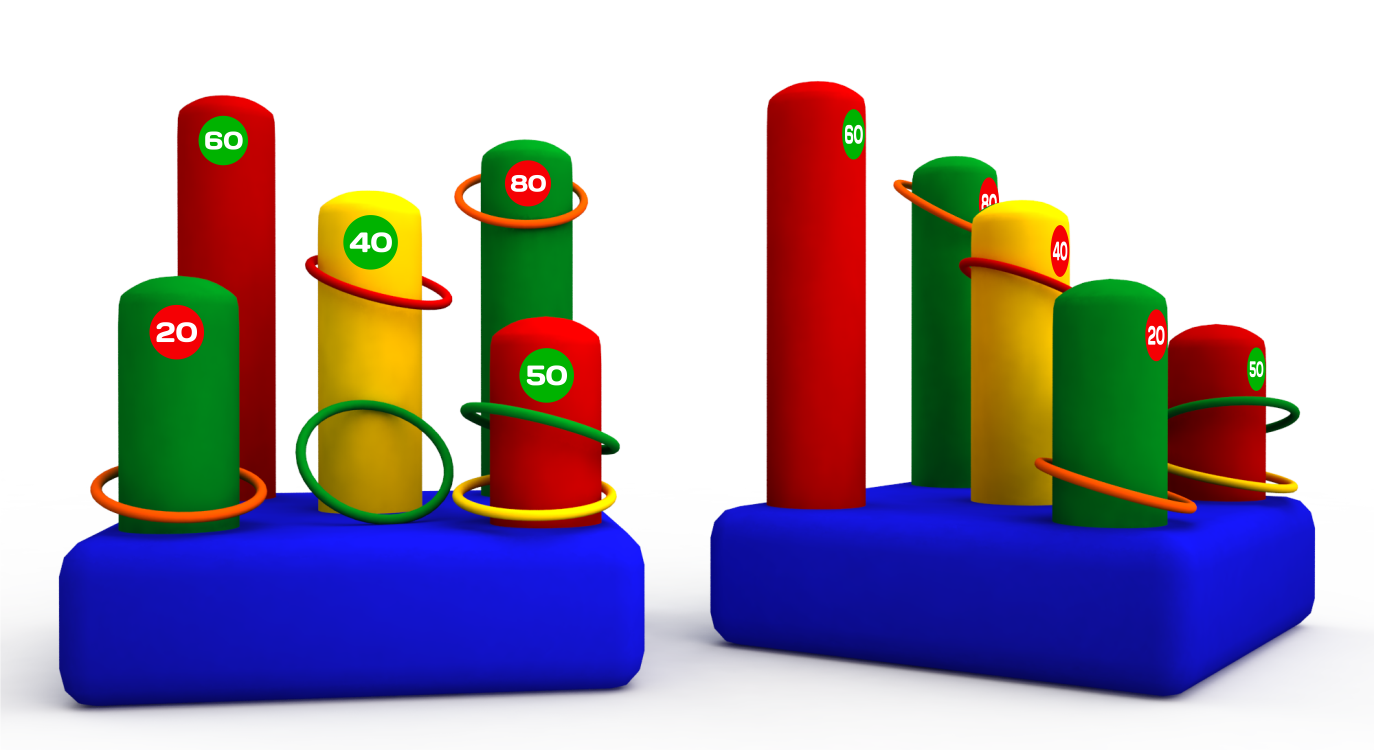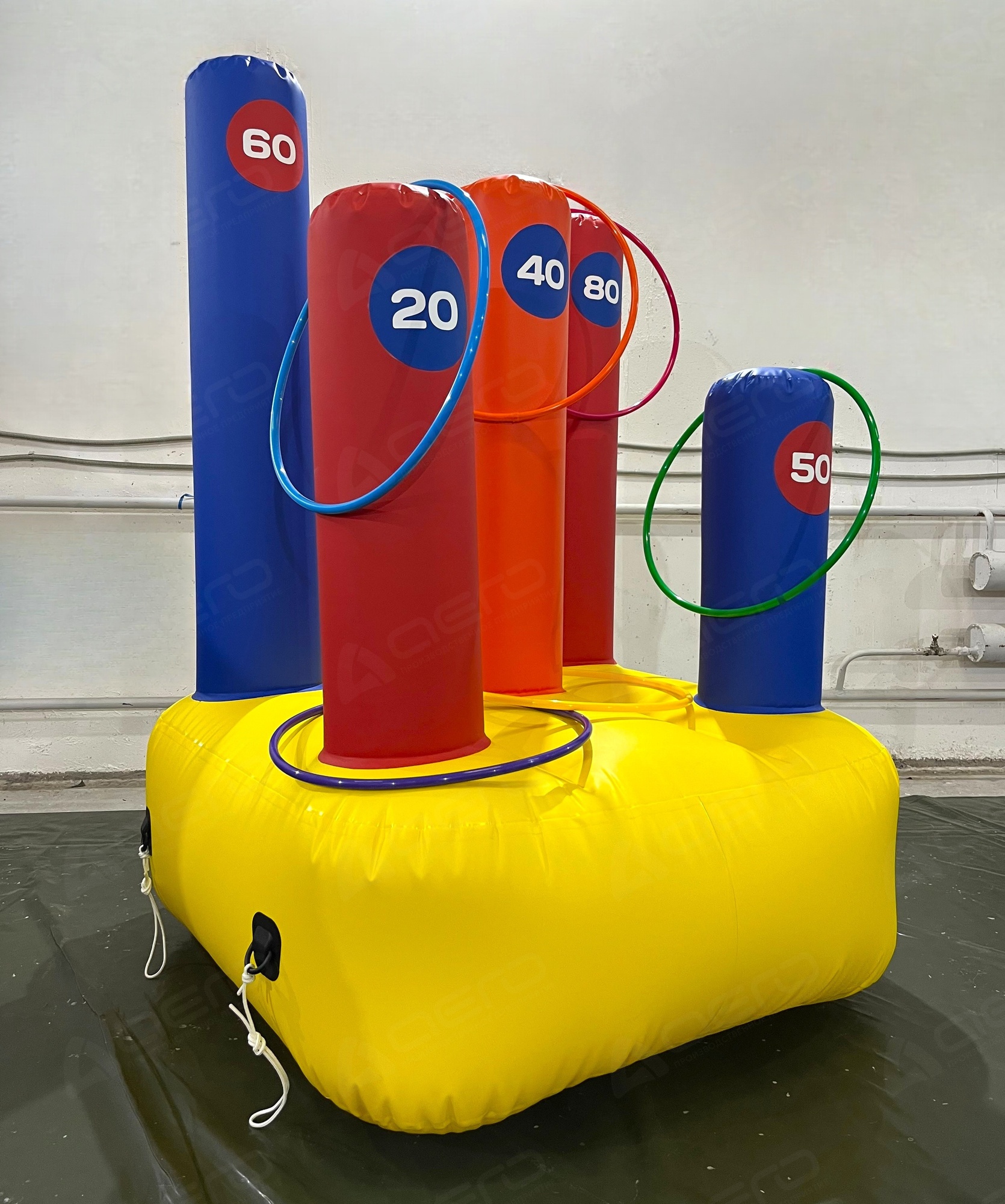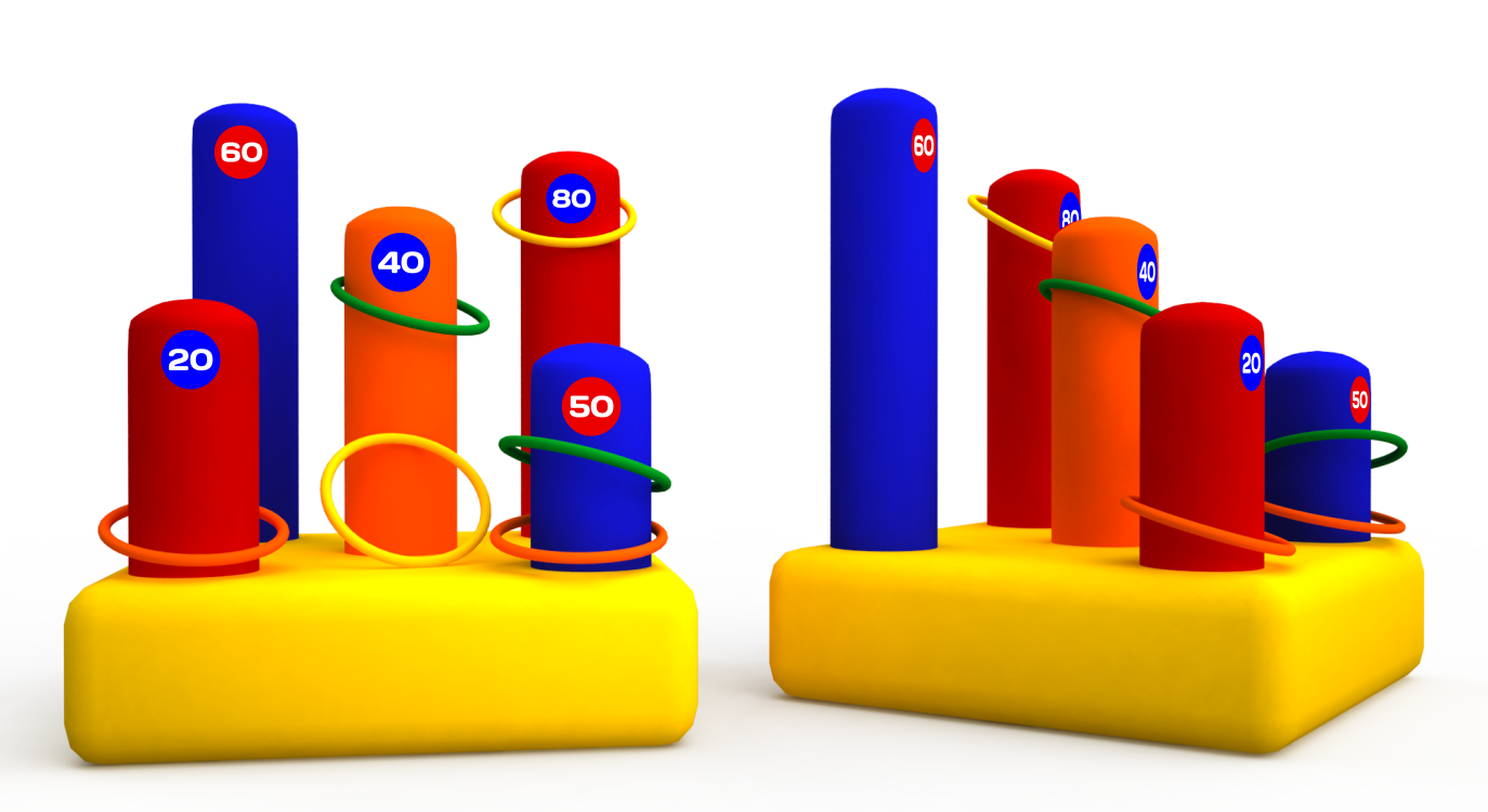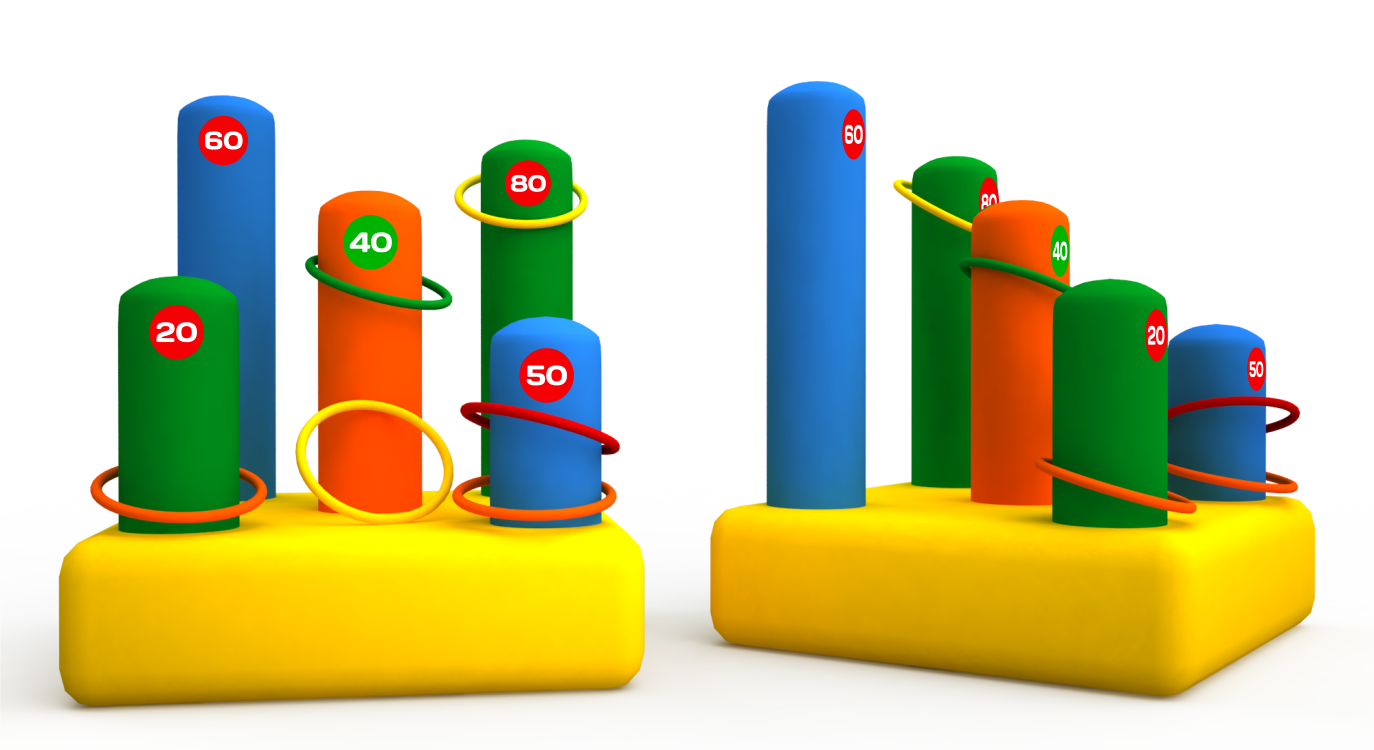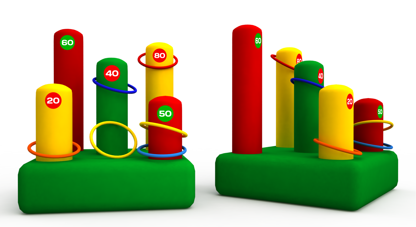 Участнику необходимо забросить кольцо на один из цилиндров и набрать наибольшее количество очков за 6 попыток (количество бросков равно количеству обручей)