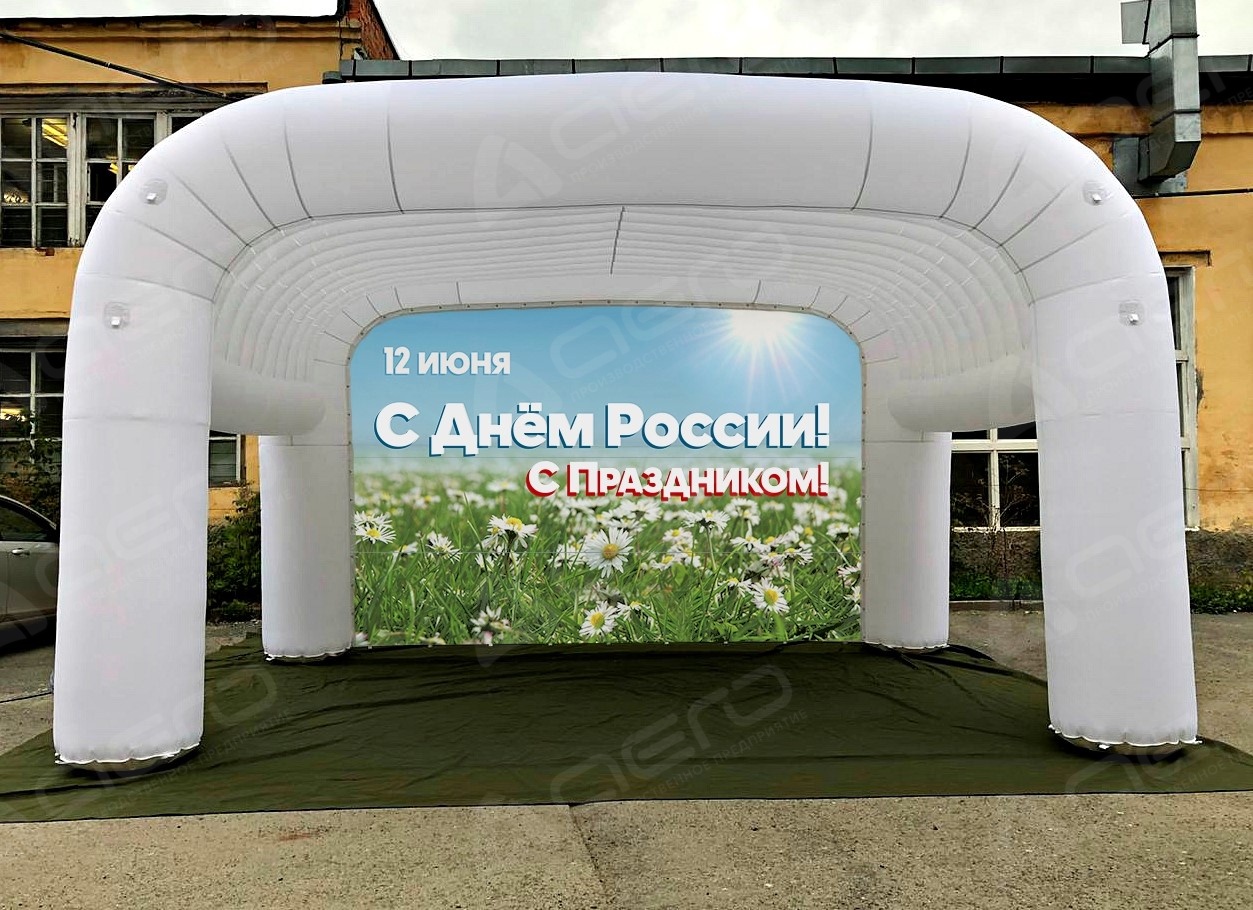 Каждый сектор может быть выполнен в своём цвете (красный, жёлтый, белый, синий, зелёный и другие), а по желанию на верхнюю или боковые опоры надувной сцены можно добавить любую из надписей - "Поздравляем!", "С Днём России!", слоган вашего предприятия, Герб города, эмблему или красочные текстуры - оплачивается дополнительно.