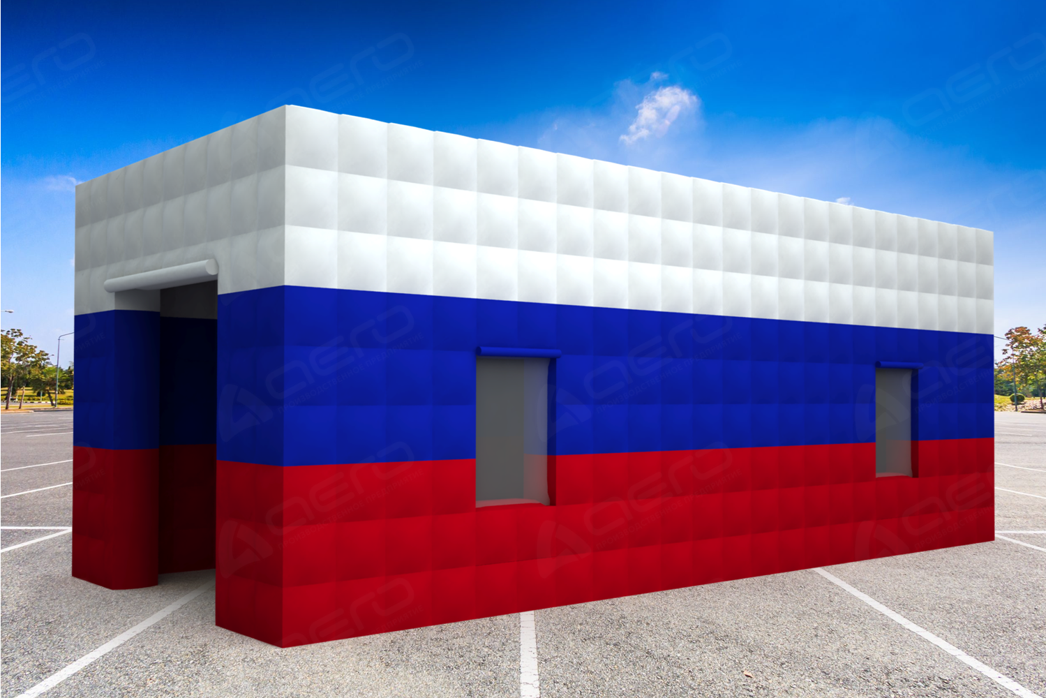 Надувной шатер "КУБ ТРИКОЛОР" с постоянным поддувом представляет собой тканевый надувной каркас. Форма и жесткость надувного каркаса обеспечивается за счет создания и поддержания внутри избыточного давления с помощью непрерывной работы устройства надува.