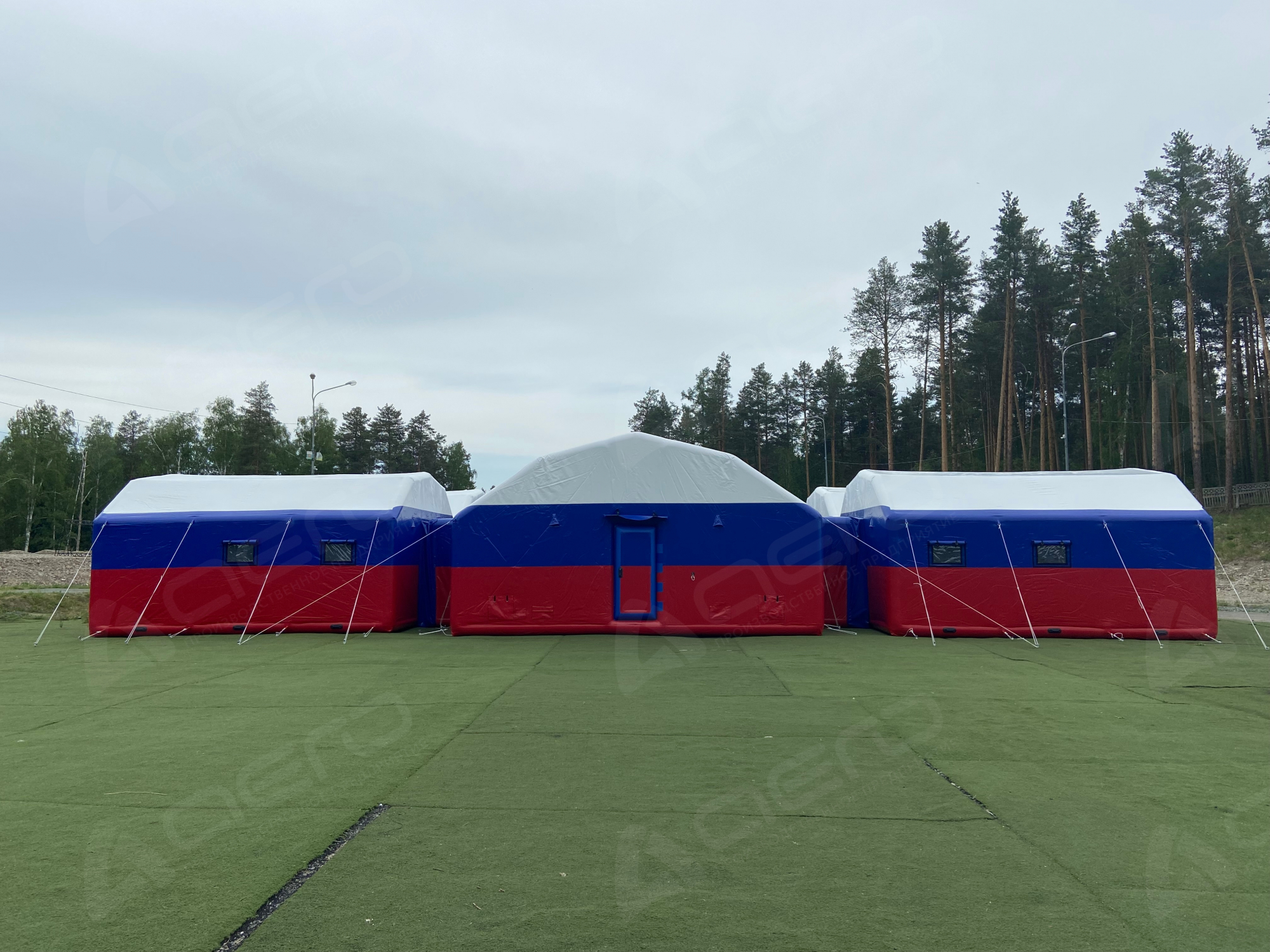 Выполнен из морозостойкой водонепроницаемой ПВХ ткани 630-650 г/м2. Тент несъёмный. С каждой стороны имеется крепёж для растяжек к грунту, для большей устойчивости на ветреной местности, а также ручки для переноса палатки в надутом виде. Слева от пневмодвери расположен информационный карман А4. |