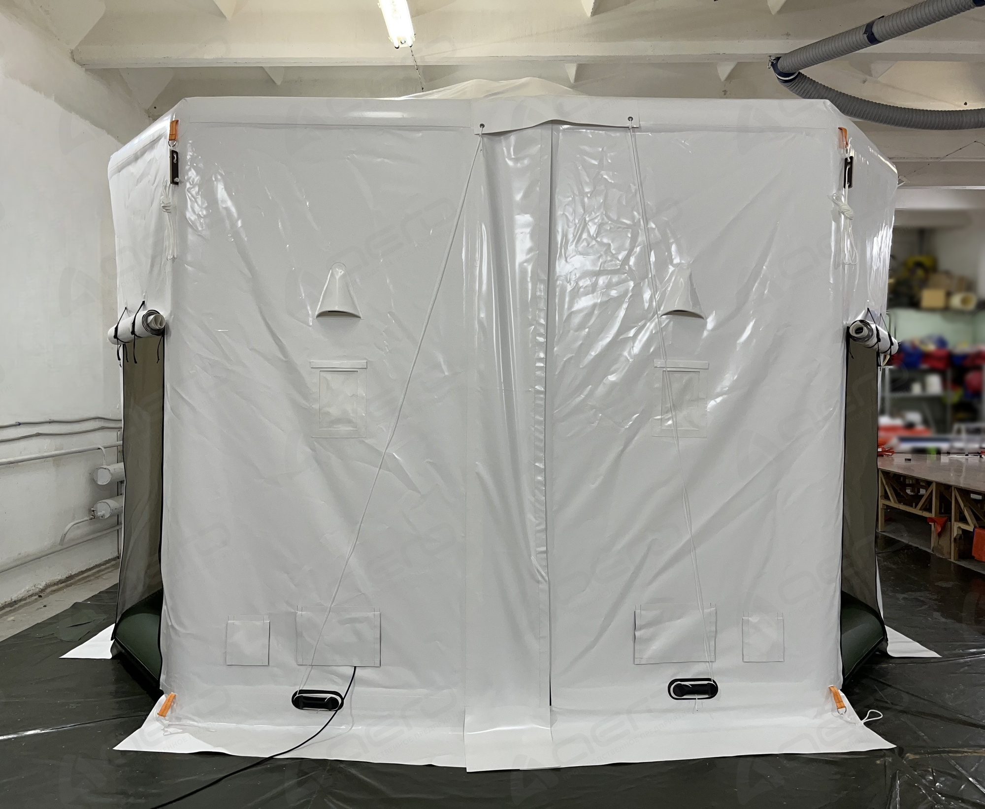 Надувное укрытие обеспечивает надежную защиту не только от осадков, но и от сильного ветра, снега и экстремальных температур, что особенно важно для поддержания работоспособности силовых установок. Использование такого укрытия позволяет техническому персоналу проводить все необходимые работы в комфортных условиях, без воздействия неблагоприятной погоды. Это существенно повышает эффективность обслуживания и снижает риск возникновения ошибок из-за неблагоприятных условий.