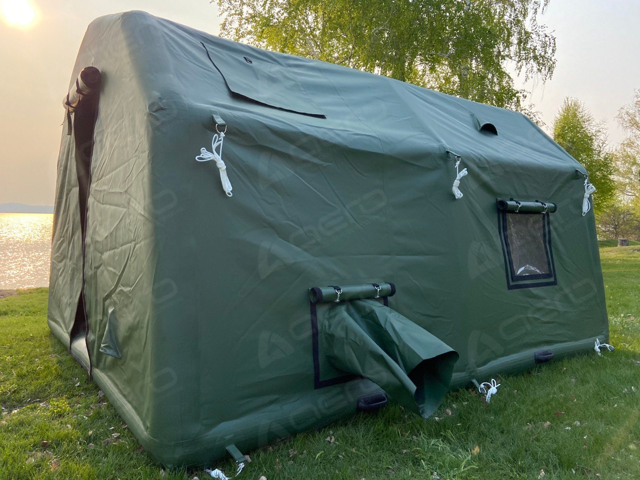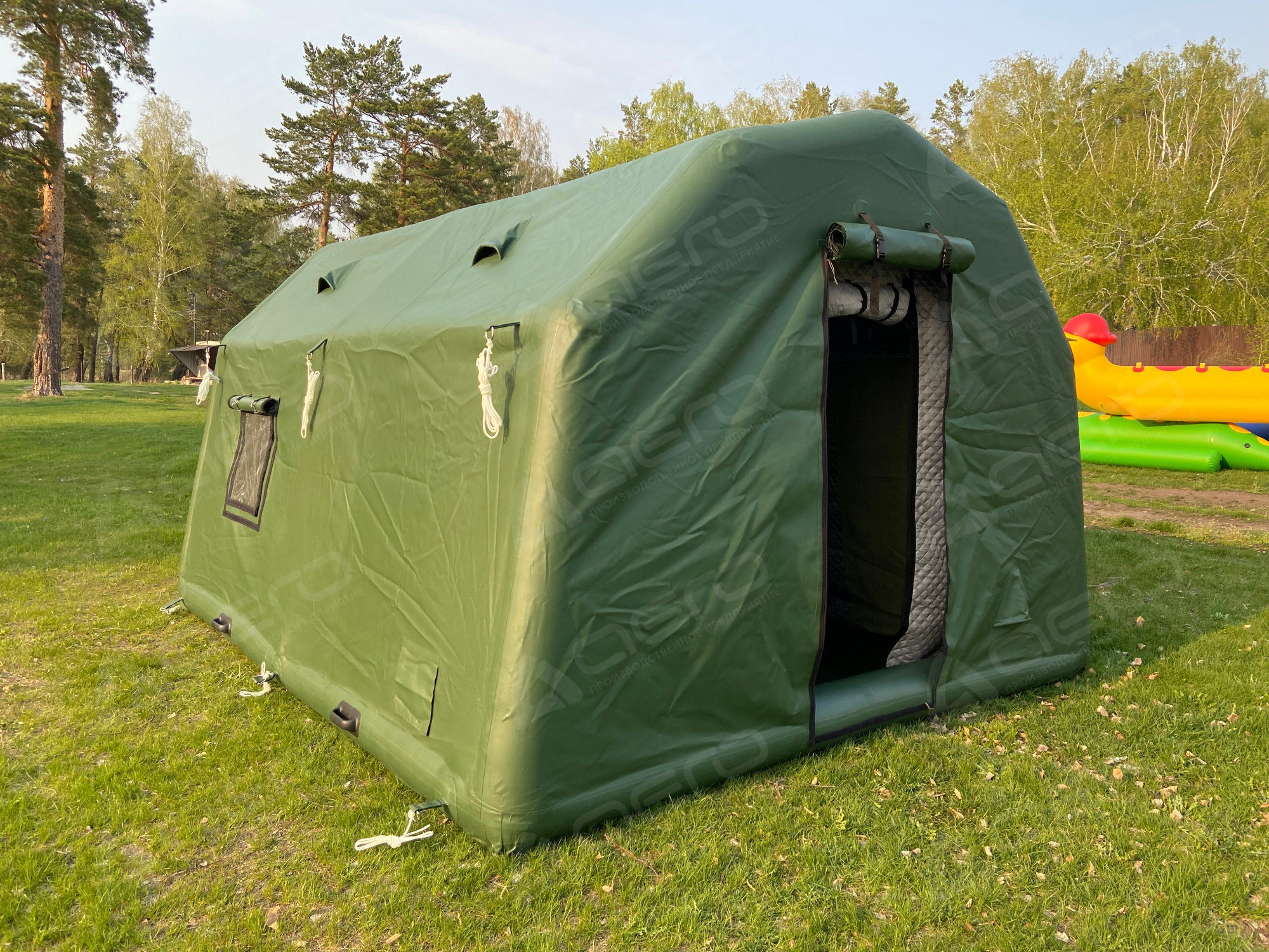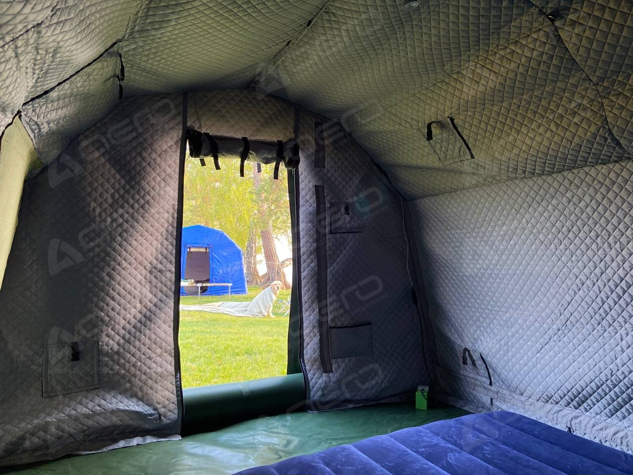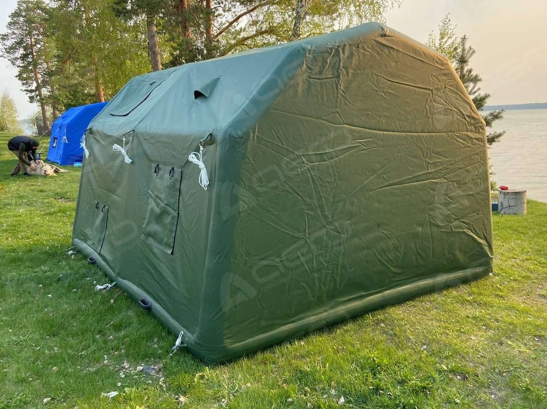 Выполнен из морозостойкой водонепроницаемой ПВХ ткани 630-650 г/м2. Тент несъёмный. С каждой стороны имеется крепёж для растяжек к грунту, для большей устойчивости на ветреной местности, а также ручки для переноса палатки в надутом виде. С левой стороны от входа располагается информационный карман А4. |