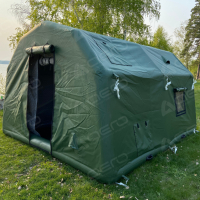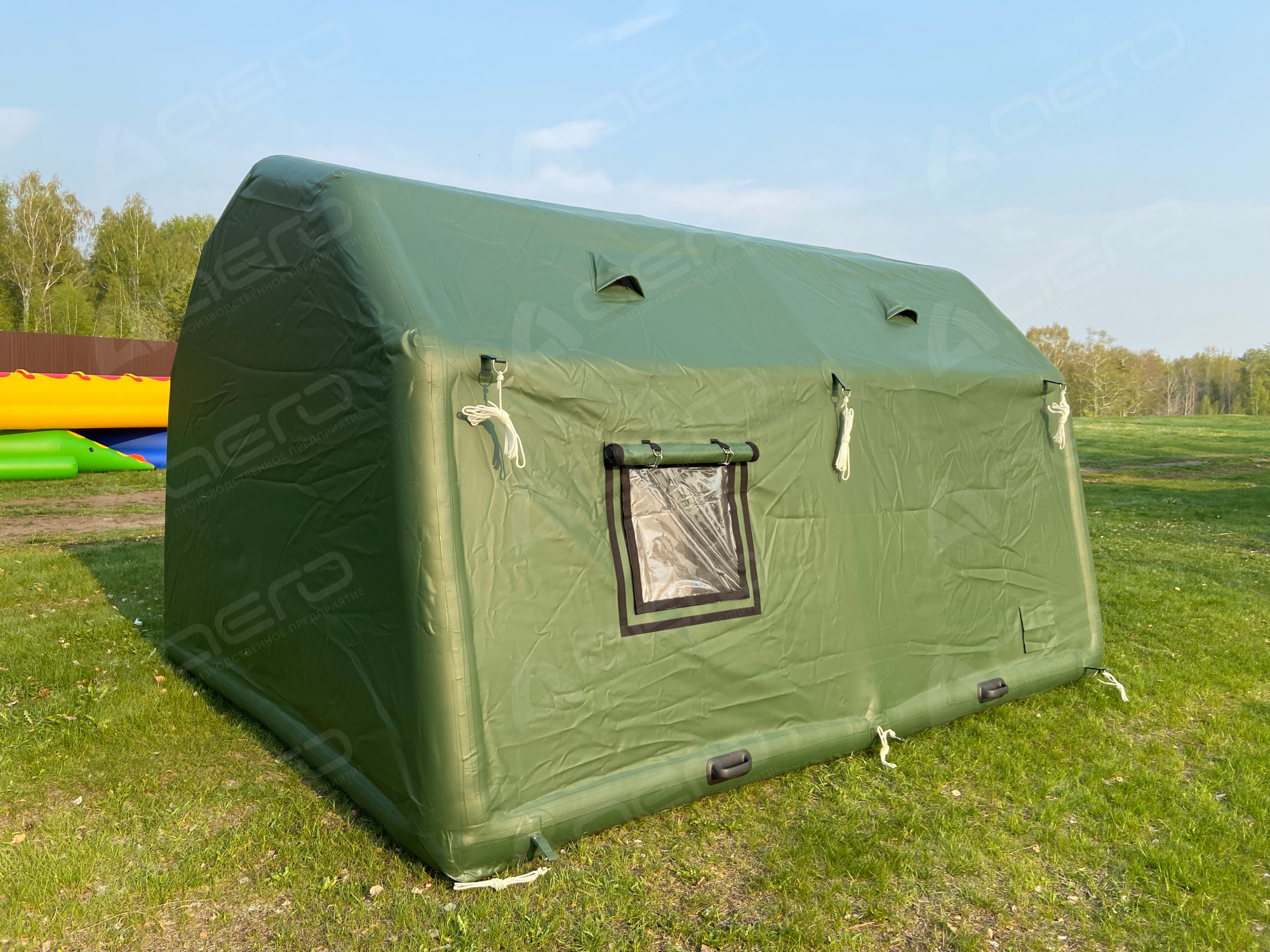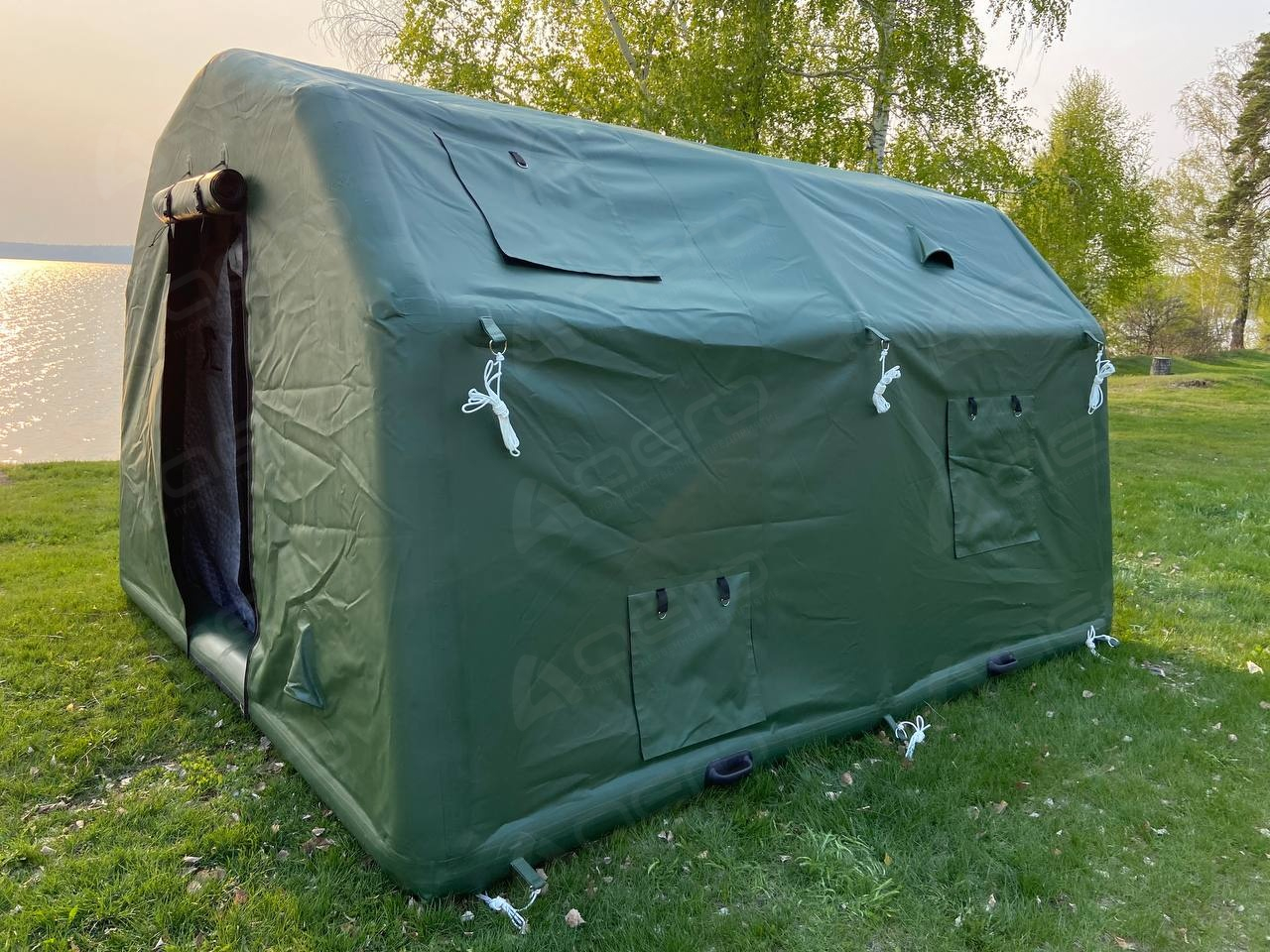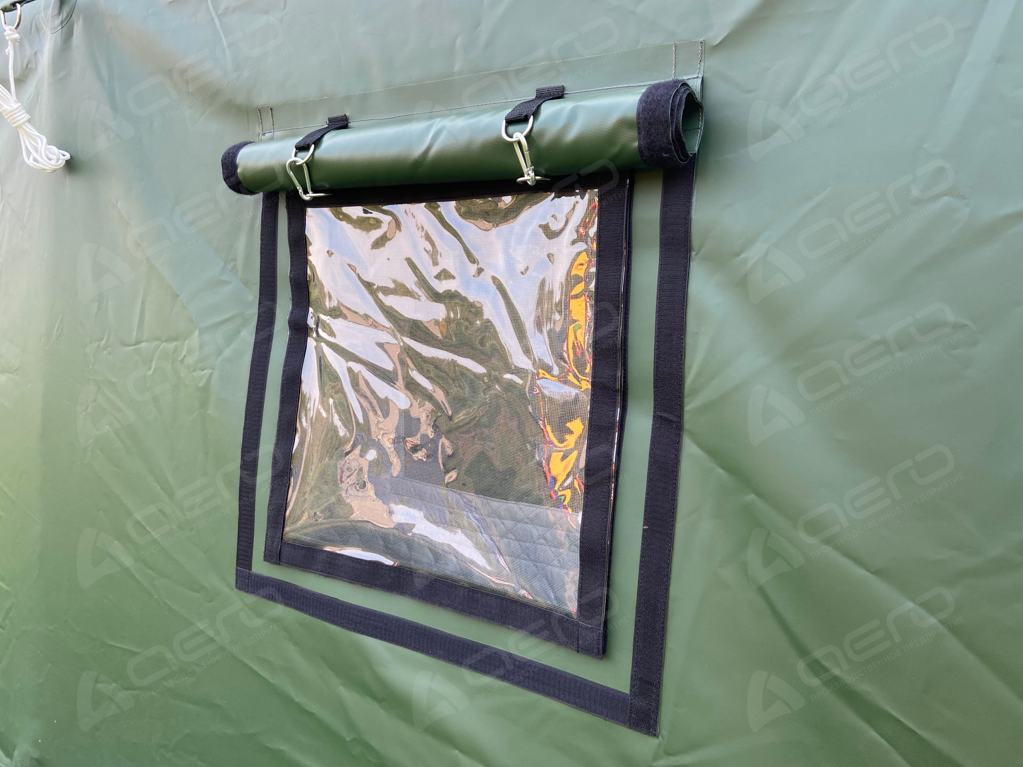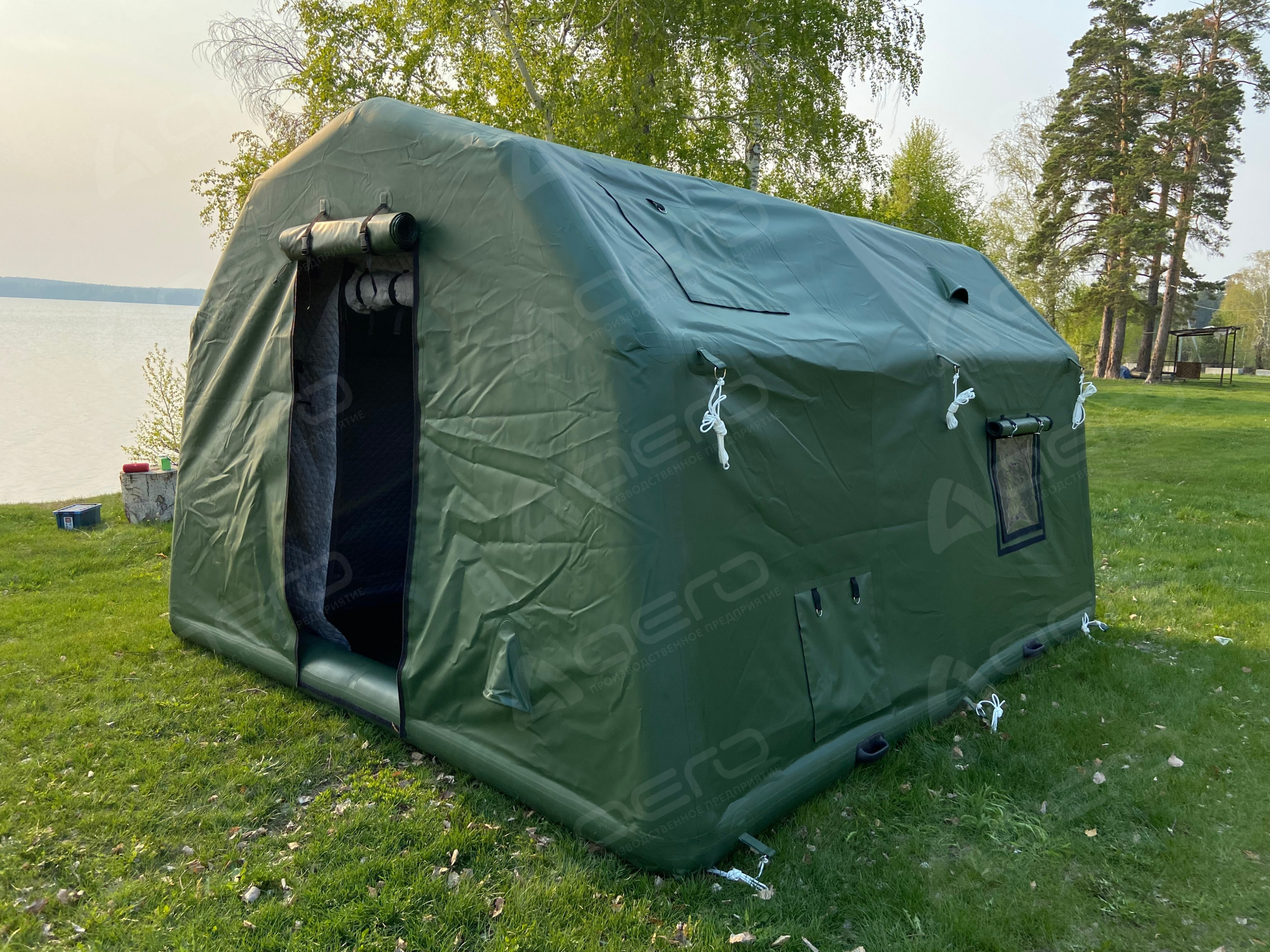 Выполнен из морозостойкой водонепроницаемой ПВХ ткани 630-650 г/м2. Тент несъёмный. С каждой стороны имеется крепёж для растяжек к грунту, для большей устойчивости на ветреной местности, а также ручки для переноса палатки в надутом виде. С левой стороны от входа располагается информационный карман А4. |