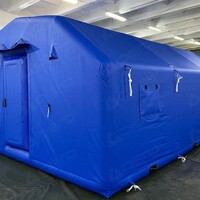 Выполнен из морозостойкой водонепроницаемой ПВХ ткани 630-650 г/м2. Тент несъёмный. С каждой стороны имеется крепёж для растяжек к грунту, для большей устойчивости на ветреной местности, а также ручки для переноса палатки в надутом виде. Слева от пневмодвери расположен информационный карман А4. |