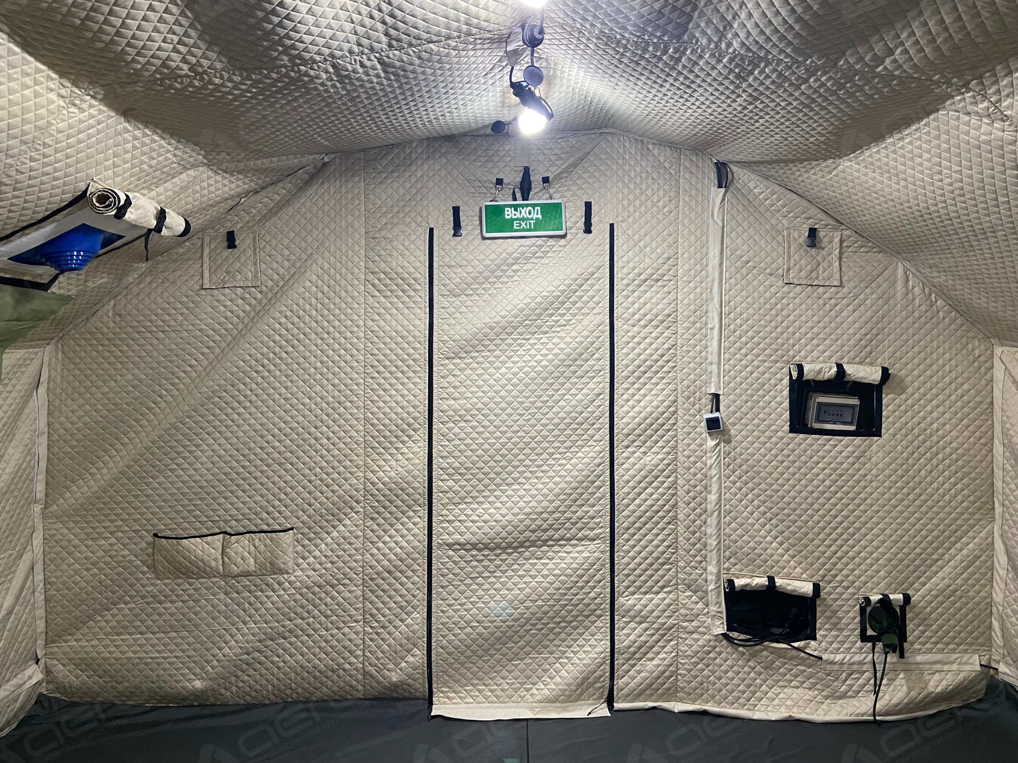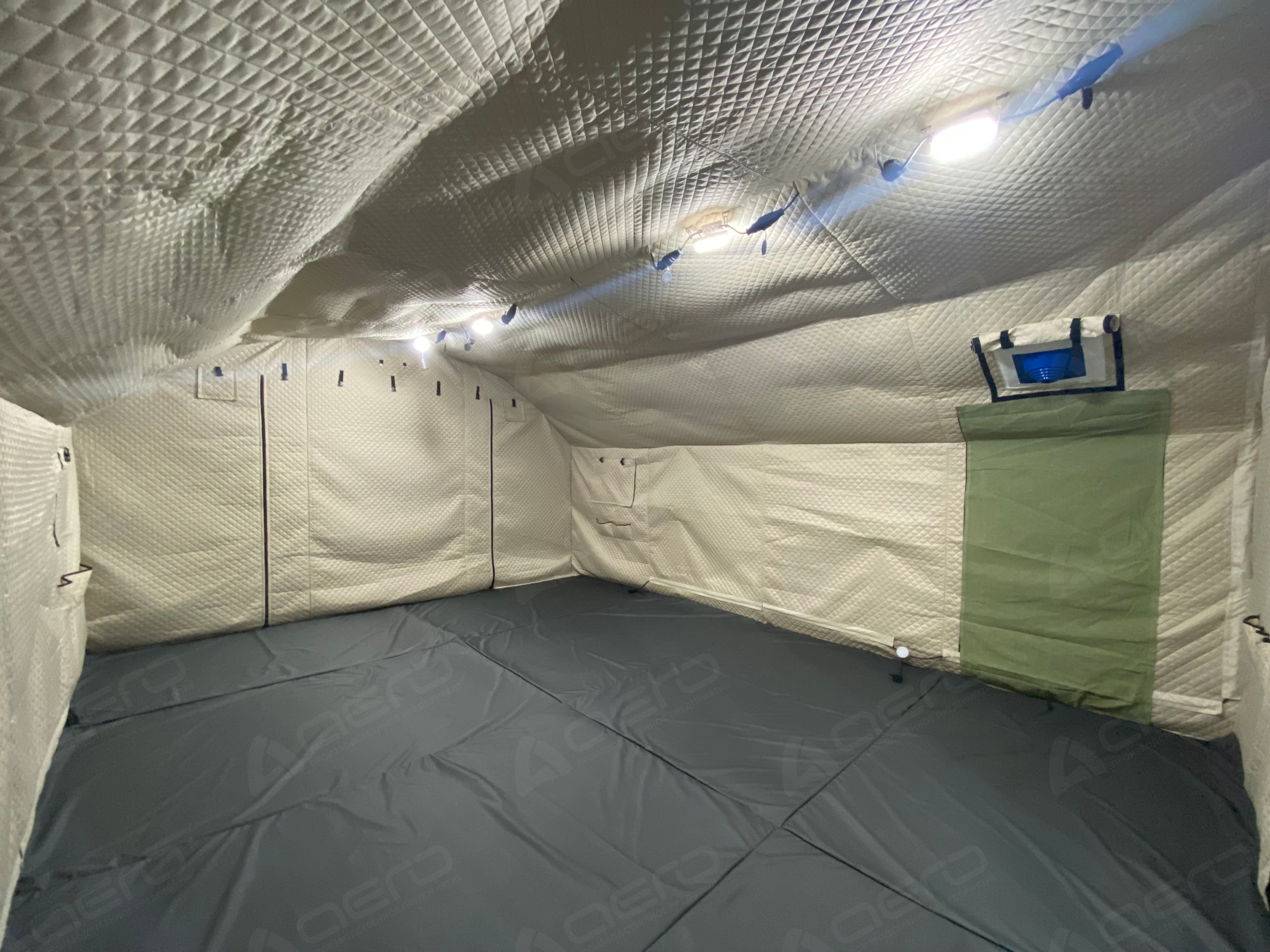 В зависимости от назначения пневмокаркасная палатка может быть укомплектована тёплыми полами, комплектом электрооборудования, оборудованием для обогрева и любой необходимой мебелью для работы и проживания сотрудников, а также для оказания помощи пострадавшим.