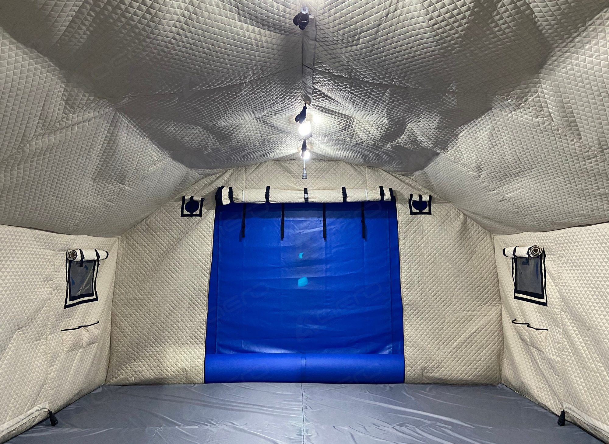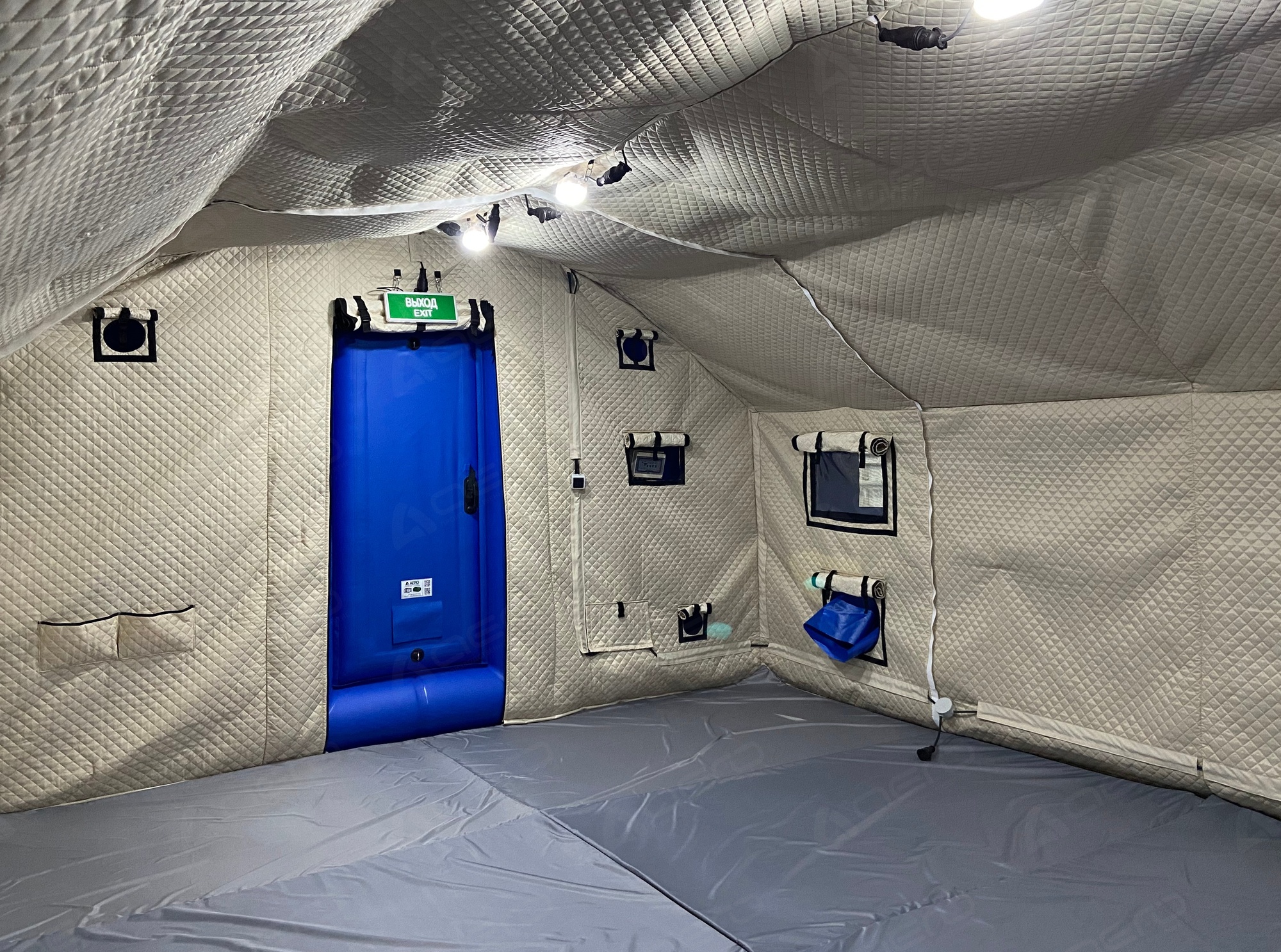 Выполнен из морозостойкой водонепроницаемой ПВХ ткани 630-650 г/м2. Тент несъёмный. С каждой стороны имеется крепёж для растяжек к грунту, для большей устойчивости на ветреной местности, а также ручки для переноса палатки в надутом виде. Слева от пневмодвери расположен информационный карман А4. |