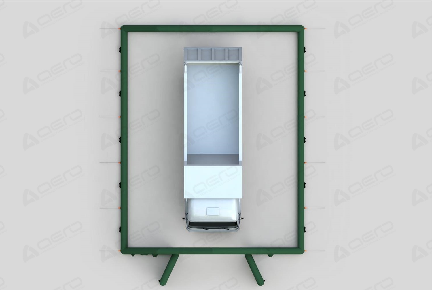Рукава для теплового оборудования и электрических кабелей предусмотрены на внешнем тенте. Наличие отсечки под печь обговаривается дополнительно.