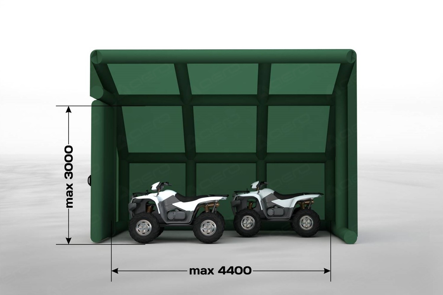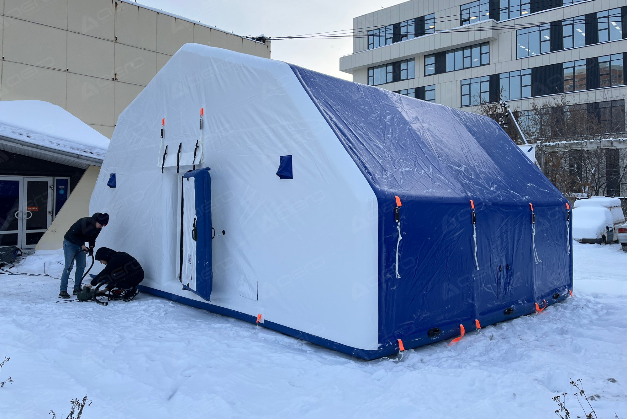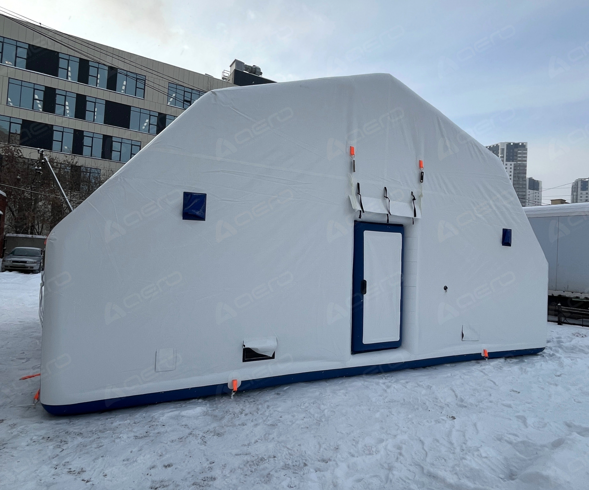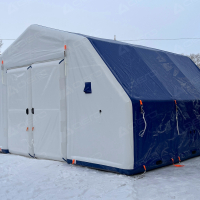 Выполнен из морозостойкой водонепроницаемой ПВХ ткани 650 г/м2. Тент несъёмный. С каждой стороны имеется крепёж для растяжек к грунту для большей устойчивости на ветреной местности, а также ручки для переноса укрытия в надутом виде.