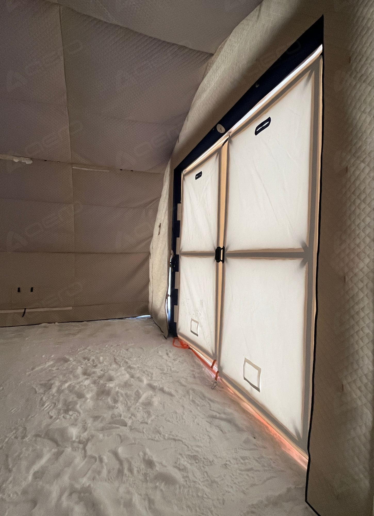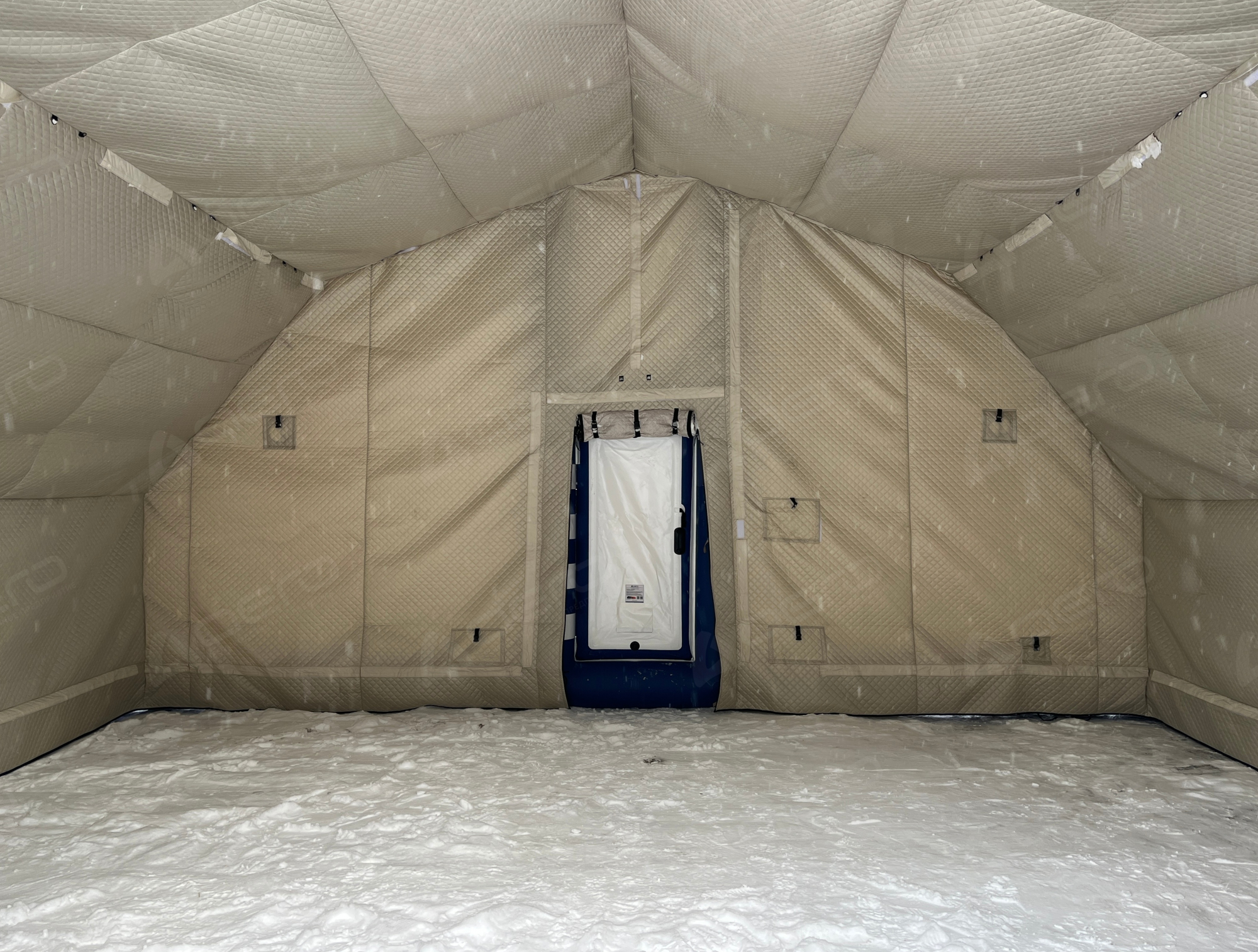 Имеет надувной каркас и отдельный клапан для надува. Размер двери 1,8м.*0,8м. Внутренняя и внешняя сторона двери выполнены из материала внешнего тента. Фиксируется в открытом положении, а также в закрытом при помощи застёжки фастекс.