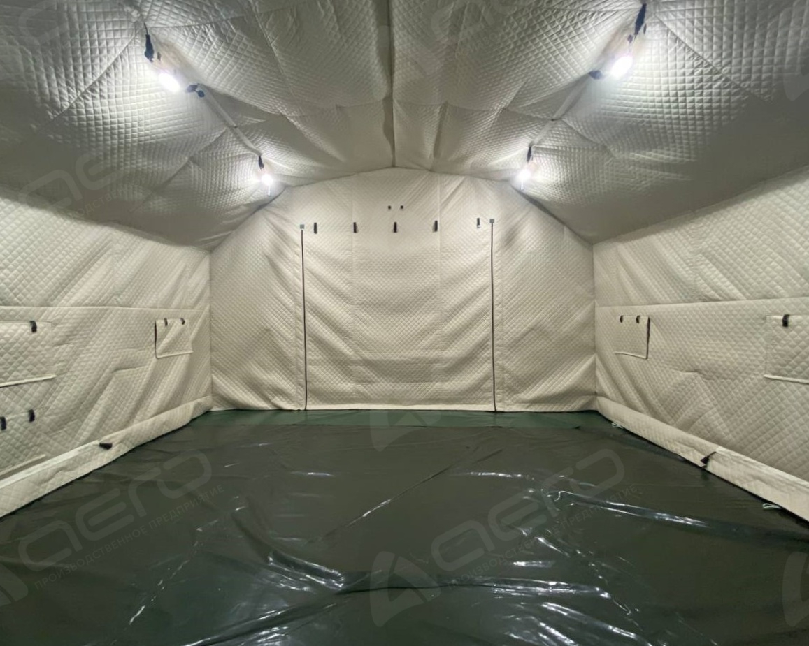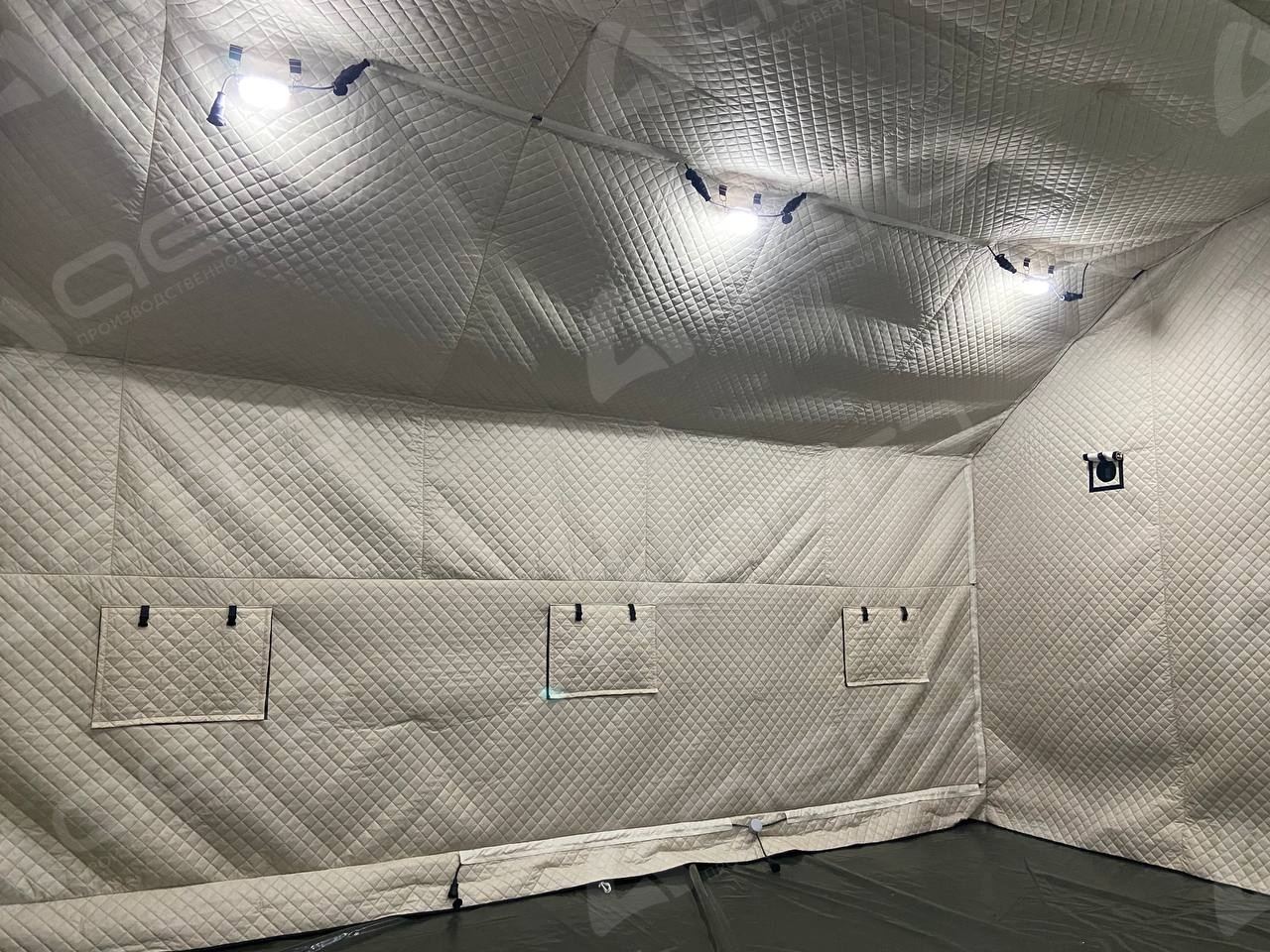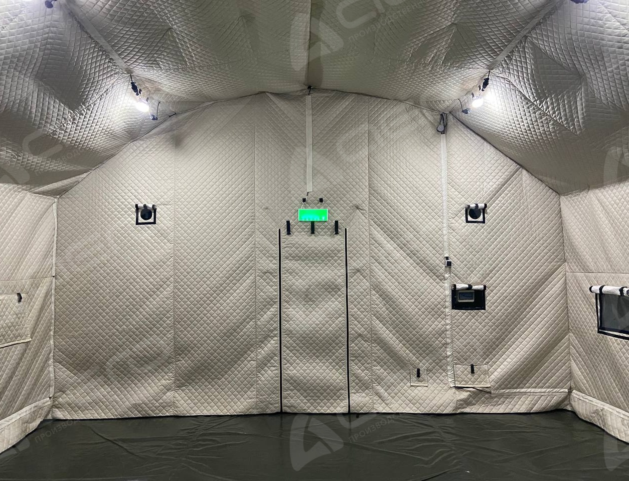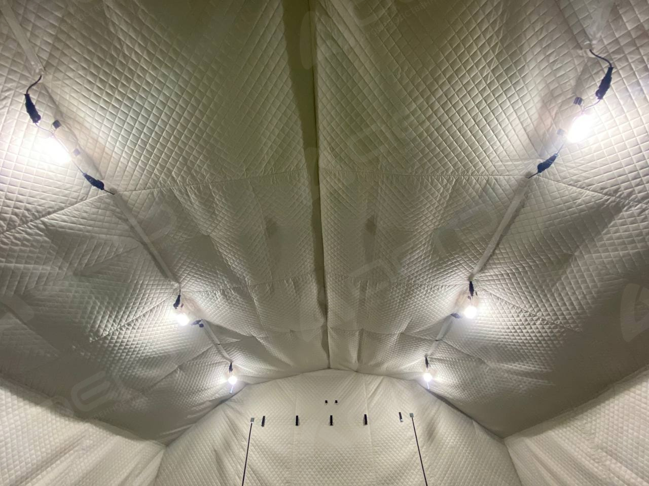 На внутреннем тенте предусмотрены крепления для кабелей электропитания в виде закрытых кабель-каналов из ткани, крепления для светодиодных светильников, а также дублирование технологических отверстий внешнего тента |