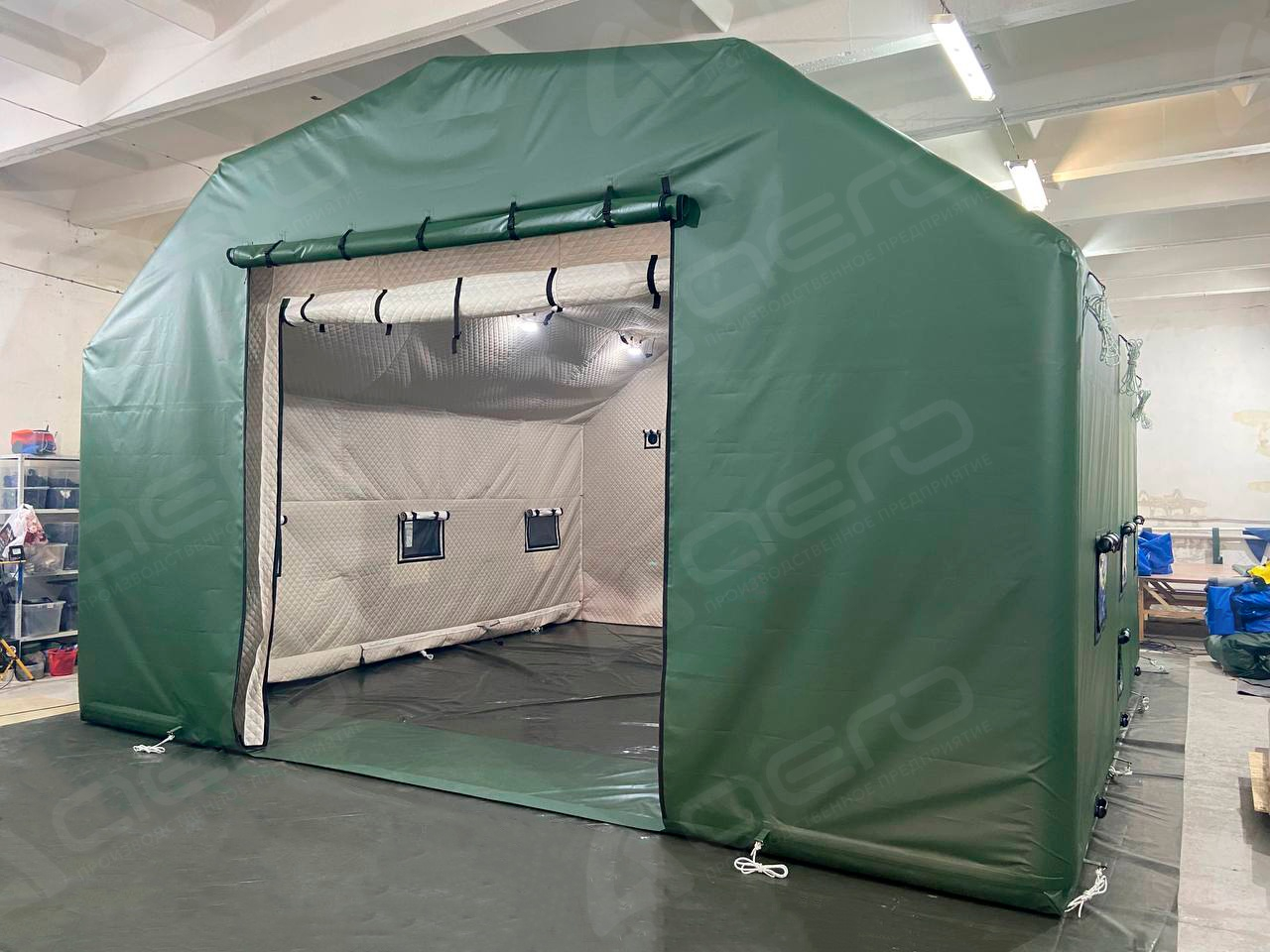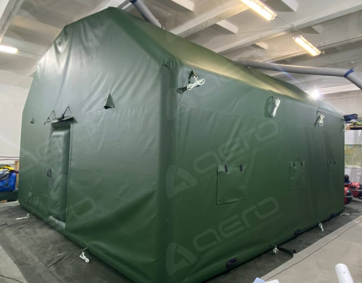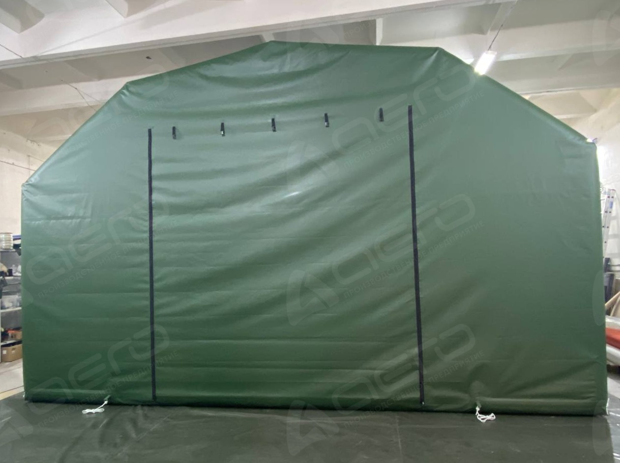 Выполнен из морозостойкой водонепроницаемой ПВХ ткани 650 г/м2. Тент несъёмный. С каждой стороны имеется крепёж для растяжек к грунту, для большей устойчивости на ветреной местности, а также ручки для переноса укрытия в надутом виде.