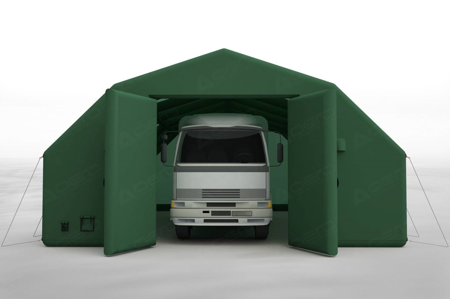 Выполнен из морозостойкой водонепроницаемой ПВХ ткани 650 г/м2. Тент несъёмный. С каждой стороны имеется крепёж для растяжек к грунту для большей устойчивости на ветреной местности, а также ручки для переноса укрытия в надутом виде.